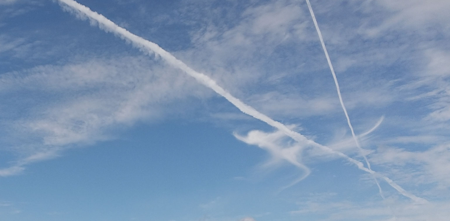 さて、飛行機雲は、水蒸気の過飽和状態の空中において、飛行機の排気ガスを凝結核とした雲です。