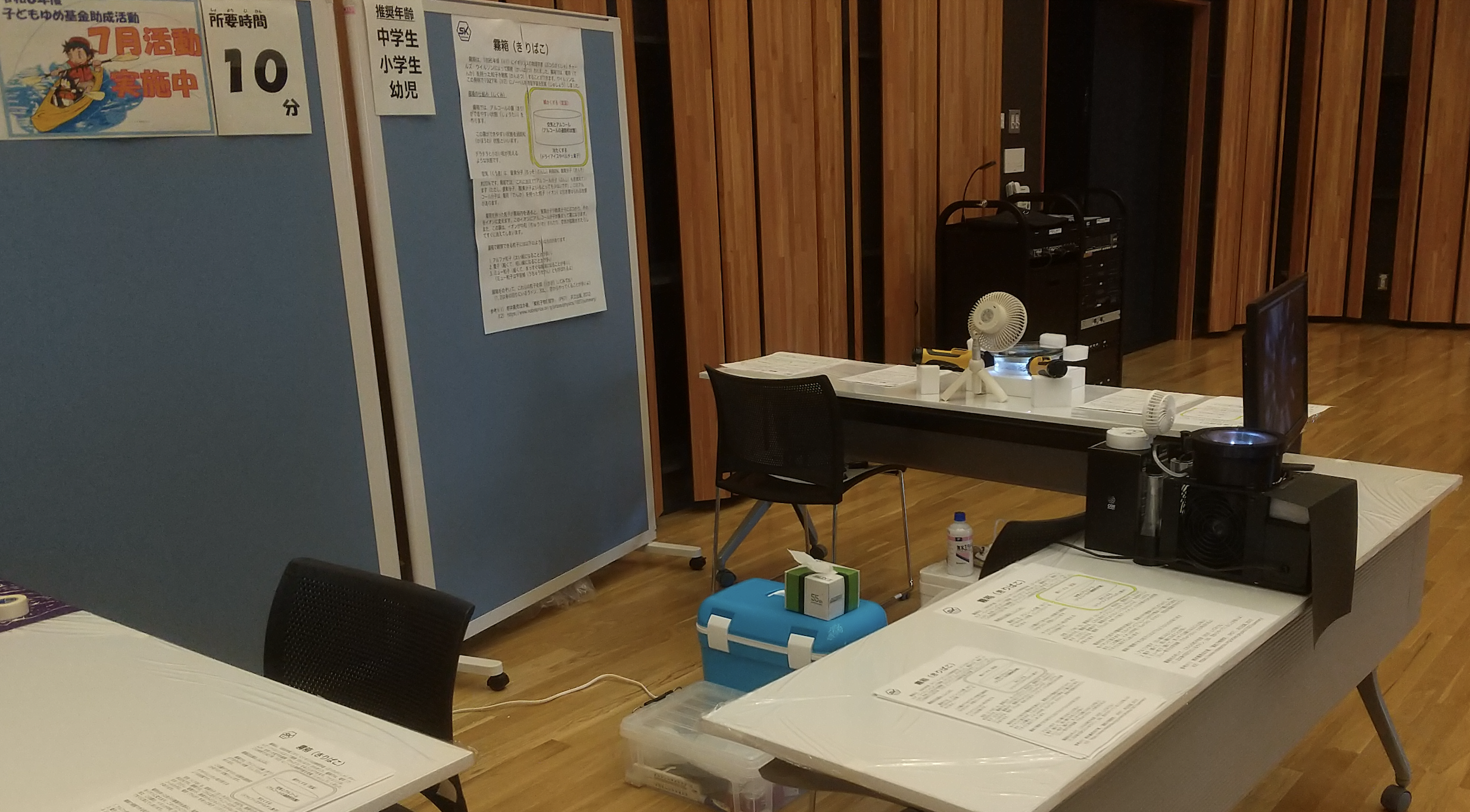 当日のセットアップ(正面のテーブルがペルチェ素子式霧箱、奥のテーブルがドライアイス式霧箱)